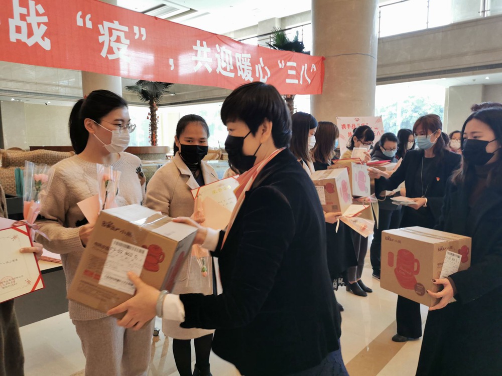 隨后總裁兼CEO孫亦農先生、首席財務官裴紅蘭女士、首席營銷官紀偉如女士、內審中心副總、銀鷺食品黨支部書記林麗霜女士為獲得一等獎的職工們送上鮮花、禮品。儀式簡單而溫馨,雖然大家都戴著口罩,但口罩擋不住她們的美麗,面對疫情,我們云擁抱、云互動,祝福是遠程的,心卻是如此貼近,這個3.8節過得比往年更有意義。