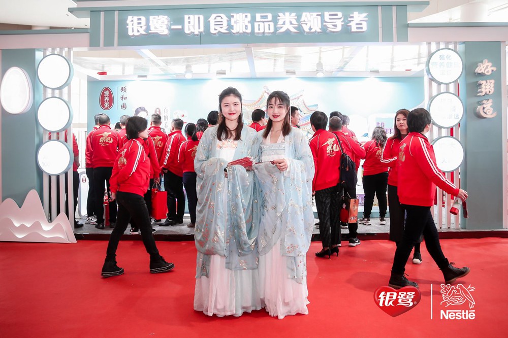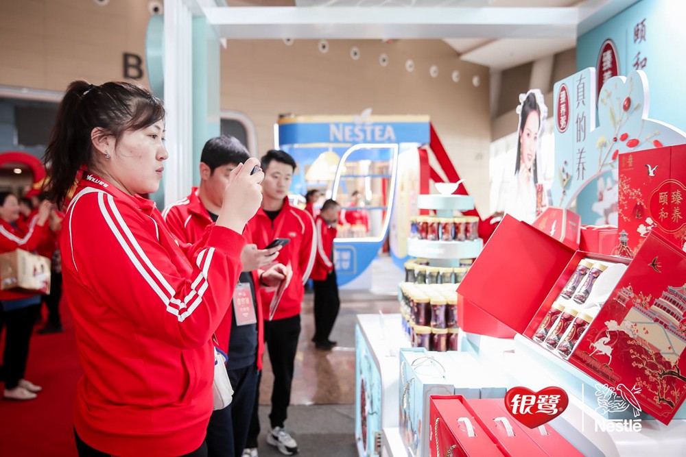 大會正式開始前,經銷商們紛紛抵達現場。不同于往年,眾多新穎時尚的產品堆頭陳列:與頤和園IP合作的臻養粥古風禮盒,雀巢咖啡世界咖啡系列等等新品,吸引經銷商們和業務團隊競相拍照、品嘗產品,現場氛圍火爆。本次大會最引人注目的是火紅色經銷商服上的“贏”字,展現了此次大會的信心與決心。